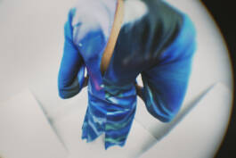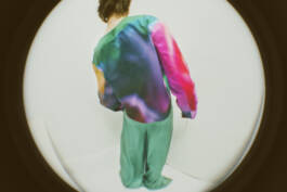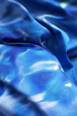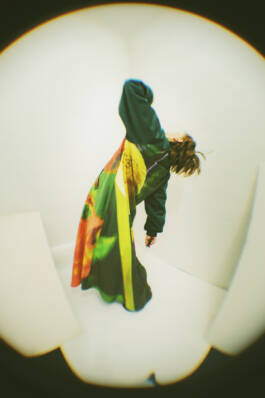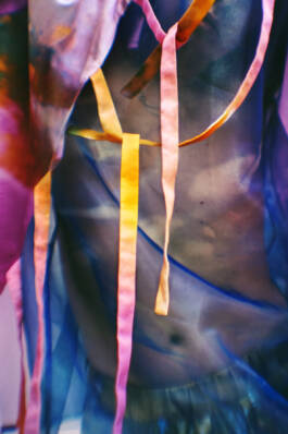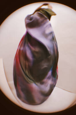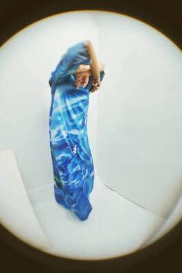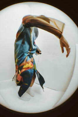 Ferrari zöchling × Erli Grünzweil (2025) is a collaboration with fashion designer Romana Zöchling. Fabrics printed with Erli Grünzweil’s photographs are taken apart, undone, and reconfigured into new forms by Zöchling. The images belong to series in which Erli traces the edges of binary structures and lets them blur into states of fluidity. Grünzweil photographs themself wearing these garments, using a lens they first held as a teenager while experimenting with self-portraiture in their childhood room. Through subtle shifts in movement and posture, body and fabric begin to fold into one another until the contours soften and the body seems to dissolve. The work is accompanied by a circular text written by Erli, echoing these gestures of transformation.