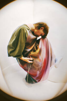 A trembling hand catches the soaked ball. The eyes focus on its fine hairs. Wavering outlines in the mist that brushes over the back of an ant. Like a dress, the damp air first envelops the arms, then the legs, and finally the whole body to seep into every pore and vaporize it from within. A final soft beam of light pushes through the clouds and turns into colors.